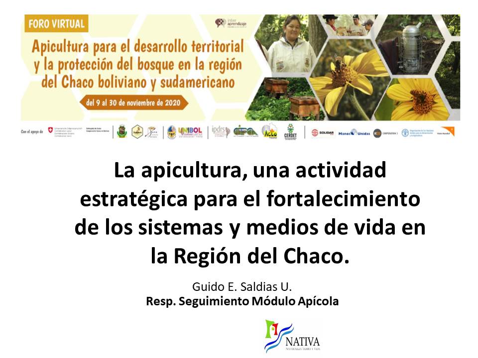 Ponemos a su disposición la Exposición: La apicultura, una actividad estratégica para el fortalecimiento de los sistemas y medios de vida en la Región del Chaco, del Lic. Guido Saldías de la Fundación NATIVA.