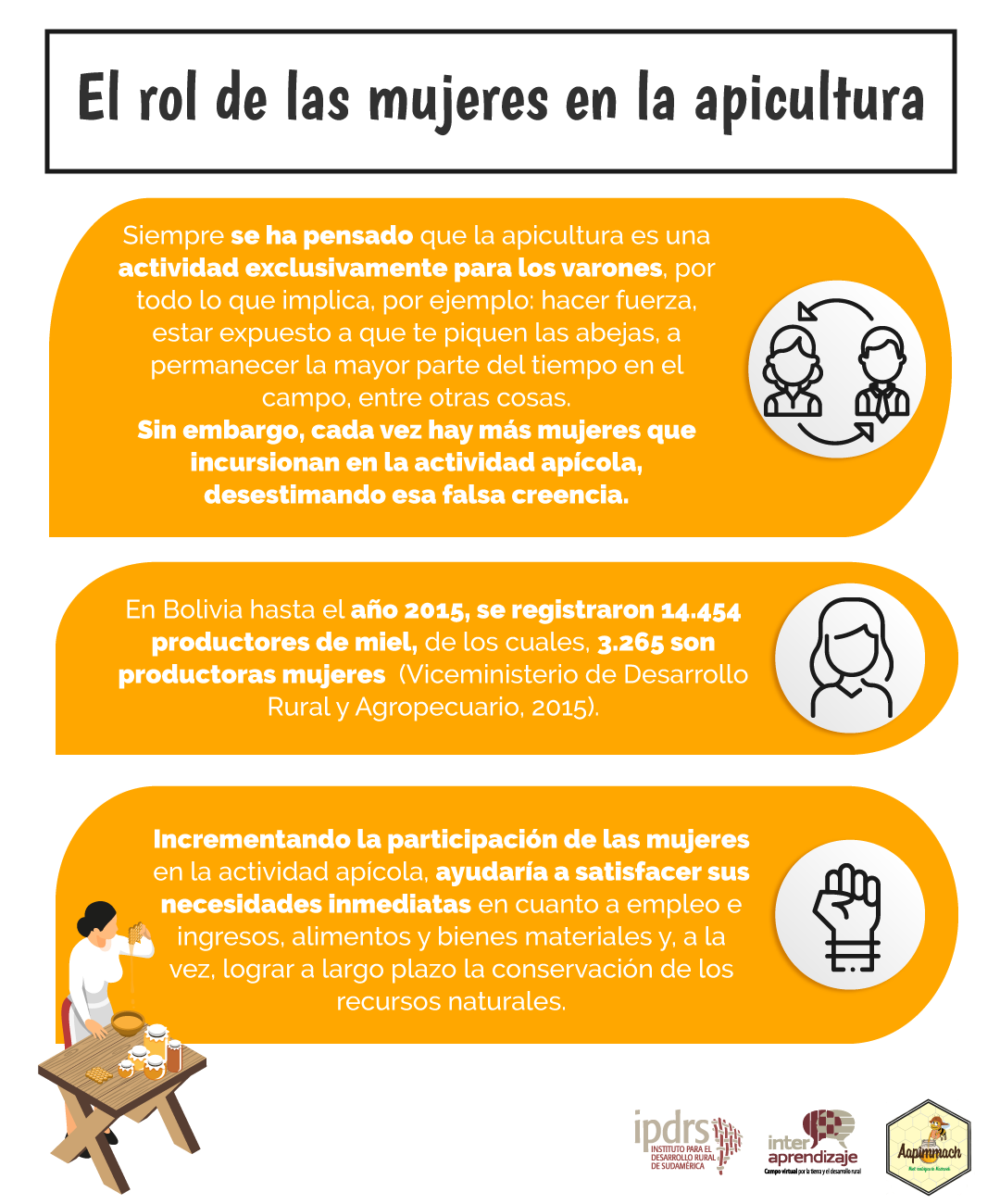 Cada vez más, las mujeres desafían a la idea, de que la apicultura es solo un trabajo de hombres. Es importante visibilizar el trabajo que realizan las mujeres en toda la cadena productiva apícola y en cuál de ellas se destacan más.