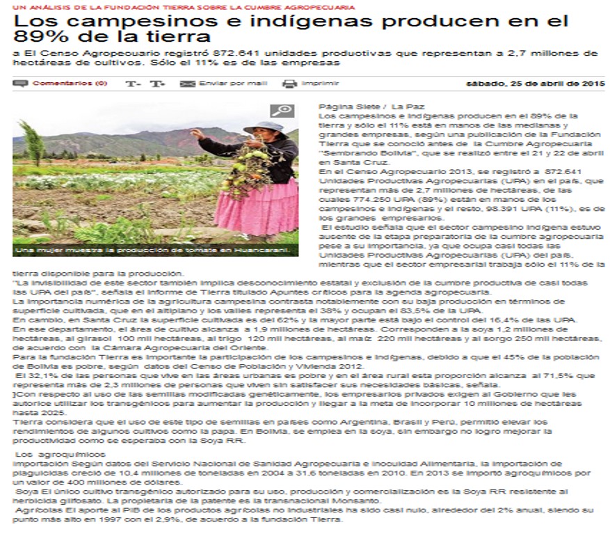 En el libro "Marginalización de la agricultura campesina e indígena” de Fundación Tierra se realiza un análisis del rol de la agricultura campesina e indígena para la seguridad y soberanía alimentaria, nos plantea una mirada como productores y consumidores de alimentos. En este sentido realiza un recorrido a las políticas agrarias gubernamentales que no han logrado plantearse como un modelo de desarrollo alternativo viable.